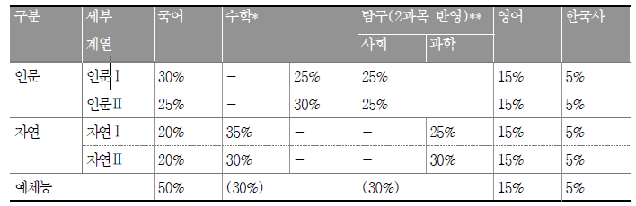※ 예체능계열의 경우 수학(선택과목 제한없음)과 탐구(사회·과학 구분없이 택2) 영역 중 반영점수가 높은 영역 반영