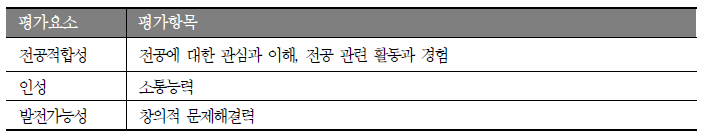 ― 학교생활기록부와 자기소개서의 내용을 바탕으로 학업역량, 전공적합성, 인성, 발전가능성으로 나누어 정성적・종합적으로 평가하여 점수를 부여함
