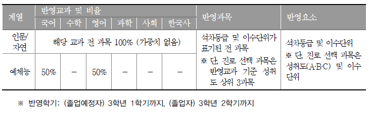 ※ 공인어학성적, 교과관련 교외수상실적, 해외봉사실적 등 사교육유발요인은 평가 미반영
