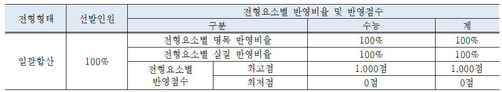 전형요소별 반영비율(배점)에 따라 전형총점의 성적순으로 모집인원의 100%를 선발