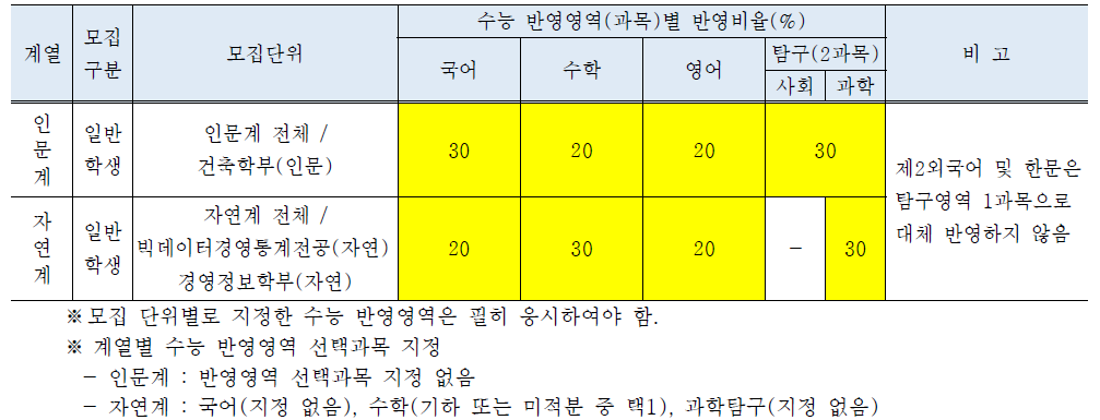 • 자연계 : 국어(20%), 수학(30%), 영어(20%),