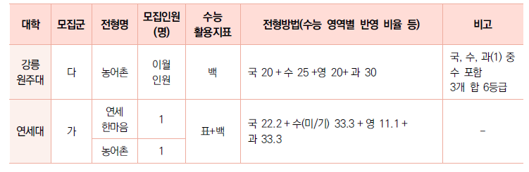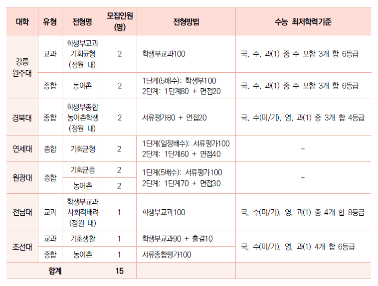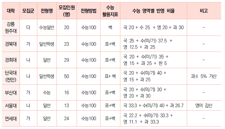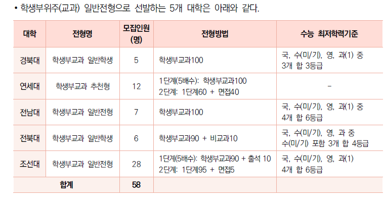 ∙ 학생부위주(교과)전형은 7개 대학에서 실시하며 114명을 모집한다. 일반전형은 5개 대학에서 실시하며 모집인원은 58명이다. 지역인재 전형으로 4개 대학이 53명을 모집하고 정원 내 고른 기회전형으로 2개대학이 3명을 모집한다.