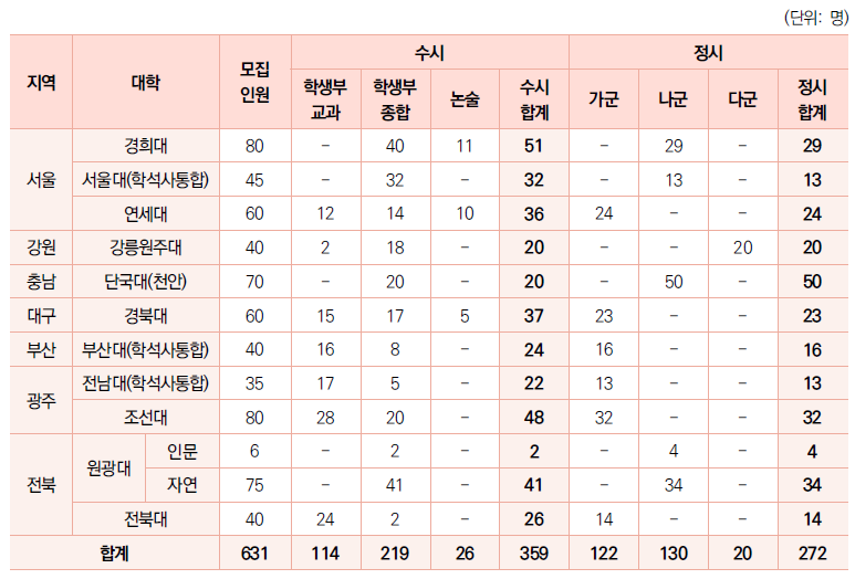 ∙ 전체 모집인원은 272명이며 가군에서 6개 대학 122명 모집한다. 전남대(8명), 전북대(5명), 조선대(8명)는 일반전형과 지역인재 전형을 동시에 실시한다. 따라서 일반전형의 모집인원은 101명이다. 나군은 4개 대학에서 130명 모집하는데 모두 일반전형이다. 단국대(천안)이 50명을 모집하여 모집 인원이 많다.