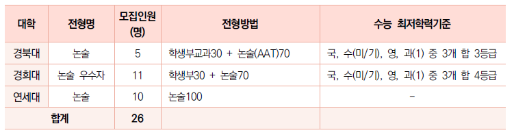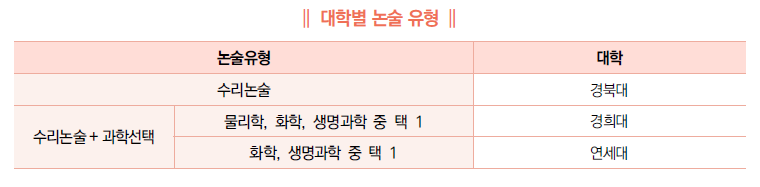 ∙ 논술전형을 실시하는 대학은 경북대, 경희대, 연세대 뿐이다. 연세대는 수능 최저학력기준을 적용하지않는다. 논술 유형을 살펴보면 경북대는 수리논술만 실시하고 경희대와 연세대는 수리논술은 필수이며 과학논술은 과목을 선택할 수 있다. 경희대는 물리학, 화학, 생명과학 중 1과목을 연세대는 화학, 생명과학 중 1과목을 선택한다.