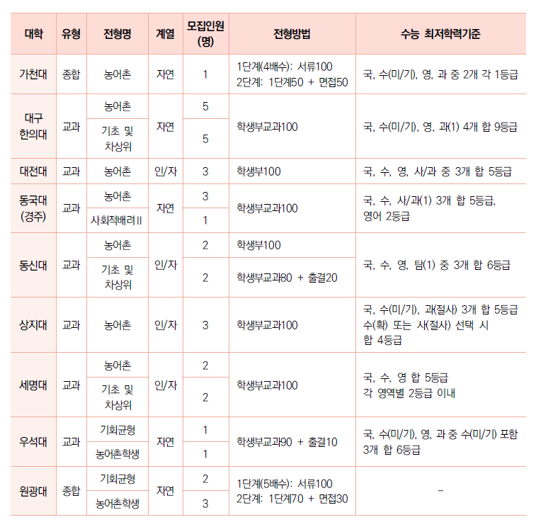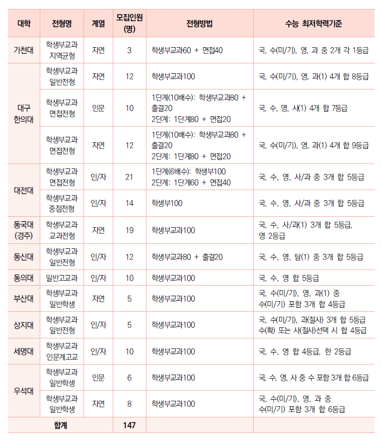 ∙ 학생부위주(교과)전형은 경희대와 원광대를 제외한 10개 대학에서 205명을 모집한다. 일반전형은 147명이며 지역인재 전형이 49명, 고른기회전형이 9명이다.