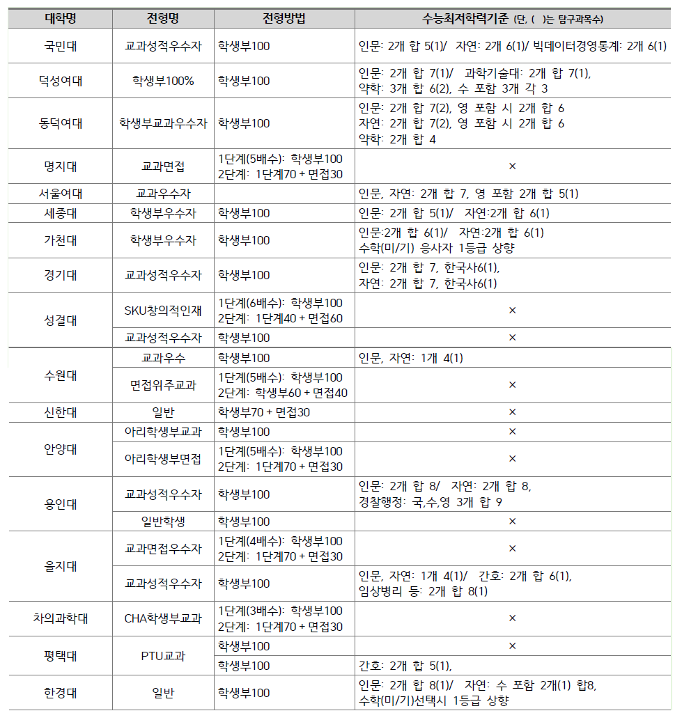 수능최저학력기준이 설정되지 않은 대학(교과 100%의 경우)은 상대적으로 합격선이 상당히 상승하는 경향이 있습니다.