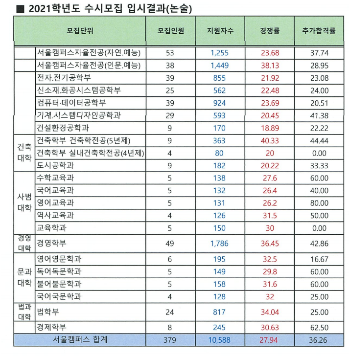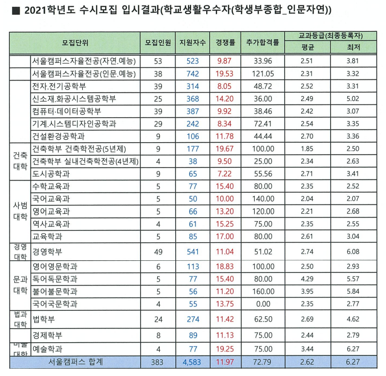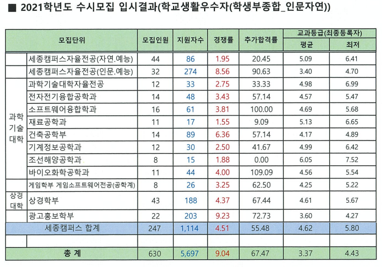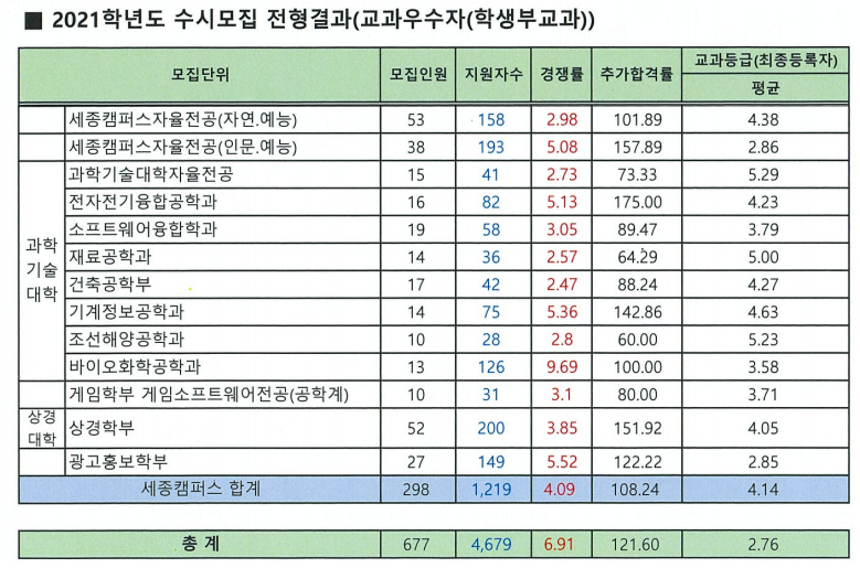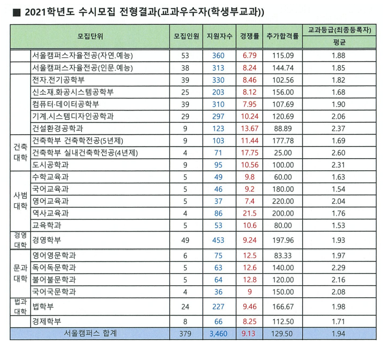 2021학년도 홍익대학교 학생부교과전형 입시결과