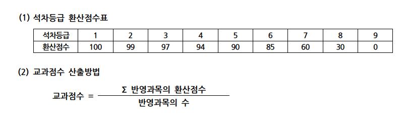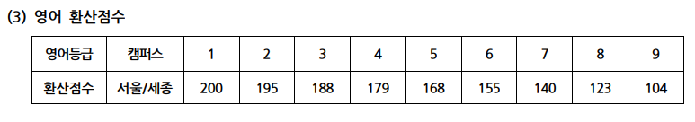 ※ 탐구영역의 경우 두 과목 표준점수의 합을 반영하며, 영어영역의 경우 등급에 따른 환산점수를 반영함