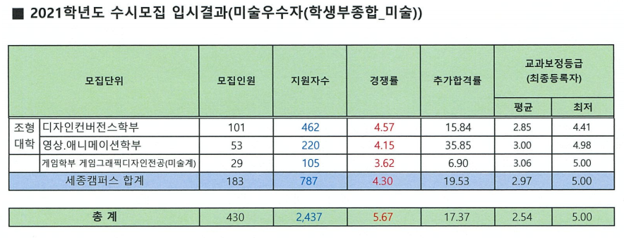 2021학년도 홍익대학교 수시 정시 결과