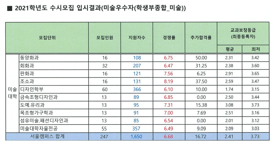 - 미술계열(예술학과 제외): 국어, 영어, 미술, 택 1(수학/사회/과학)
