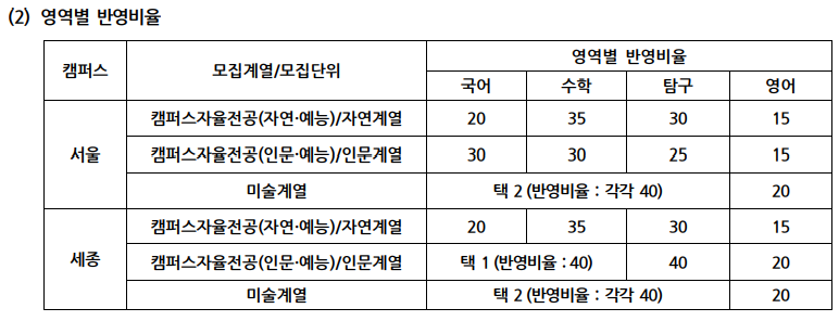 - 캠퍼스자율전공/자연계열/인문계열/예술학과: 국어, 영어, 수학, 택 1(사회/과학)