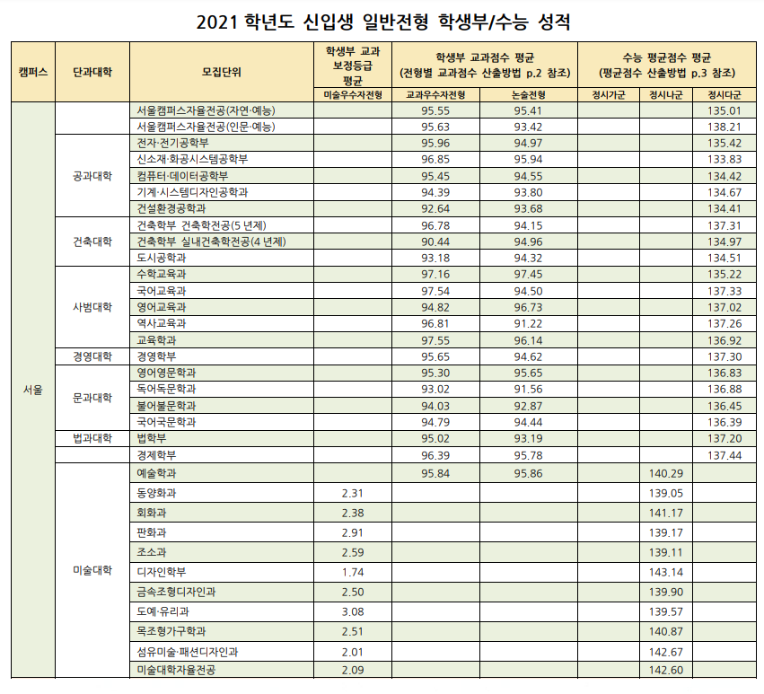 - 캠퍼스자율전공(인문,예능)/예술학과: 국어, 영어, 수학, 택 1(사회/미술)