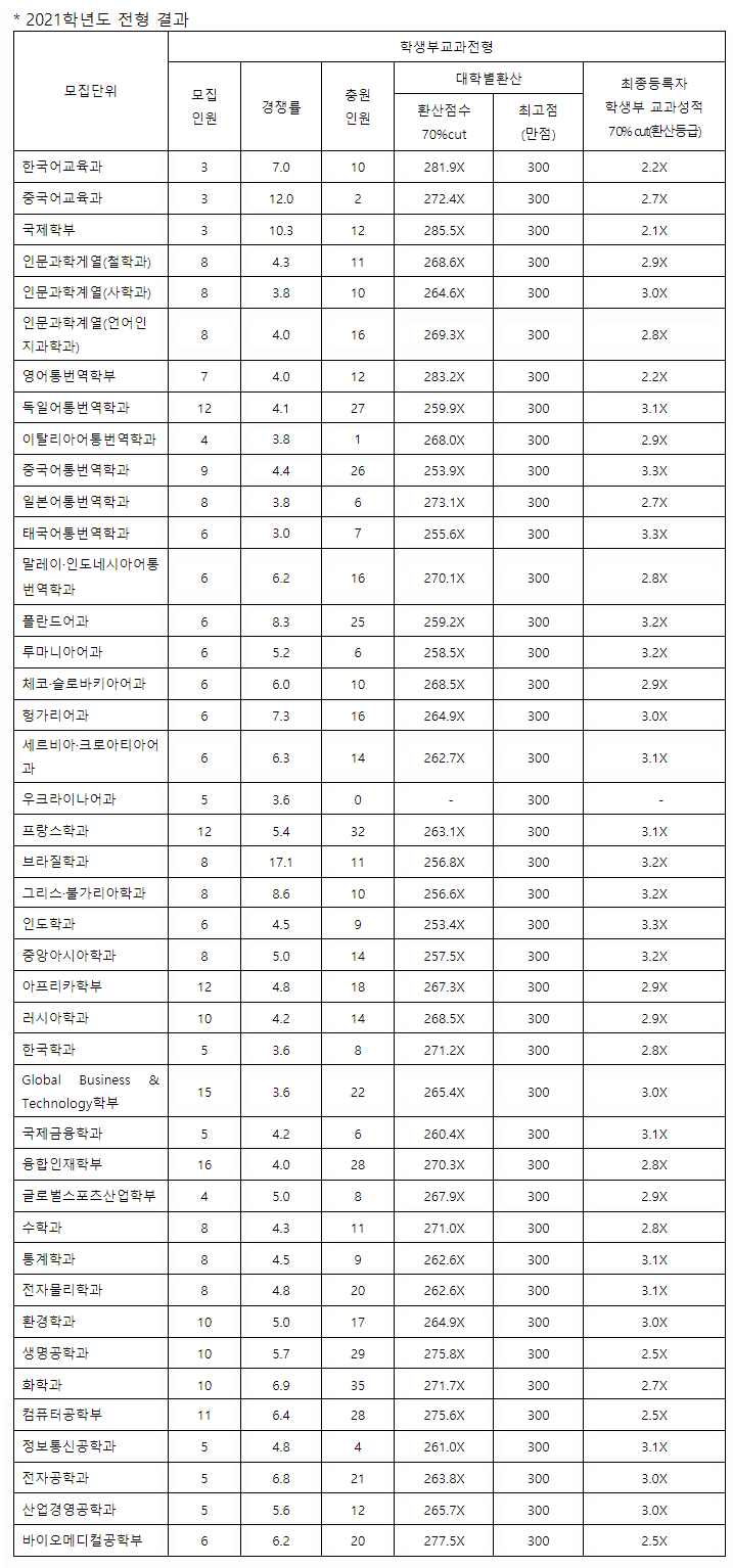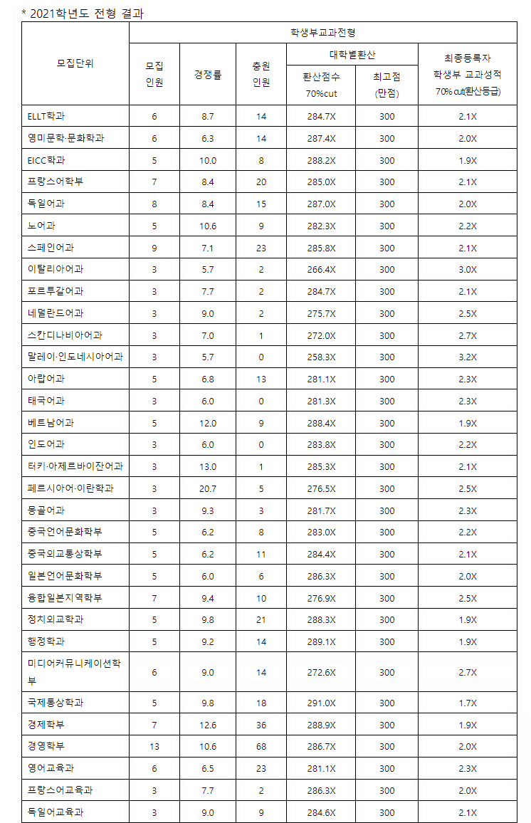 한국외국어대학교 2021학년도 학생부종합전형 교과전형등급컷 정시백분위컷