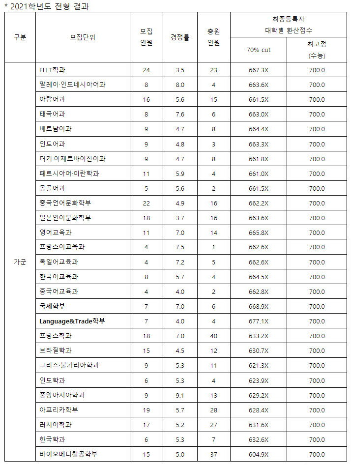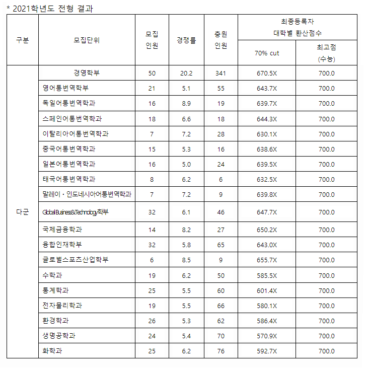 한국외국어대학교 2021학년도 수시 등급컷 정시백분위 70%컷