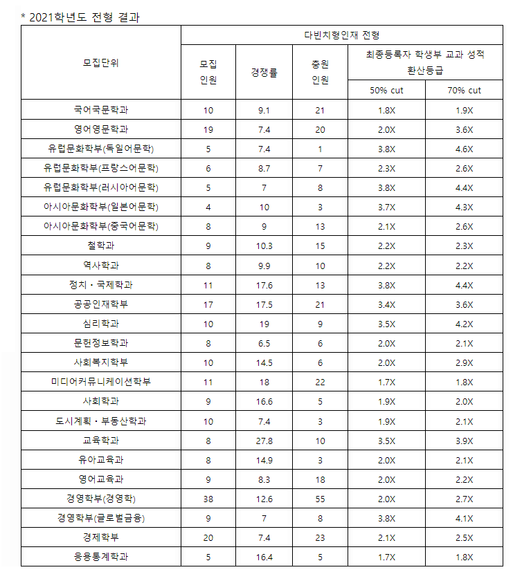 중앙대학교 2021학년도 학생부종합전형(다빈치형인재) 교과성적70%컷 50%cut