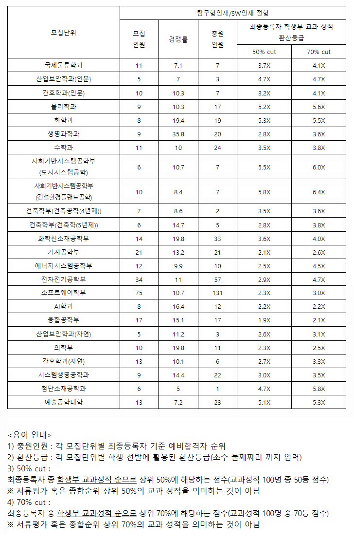 중앙대학교 2021학년도 학생부종합전형(탐구인재/SW인재) 교과성적70%컷 50%cut