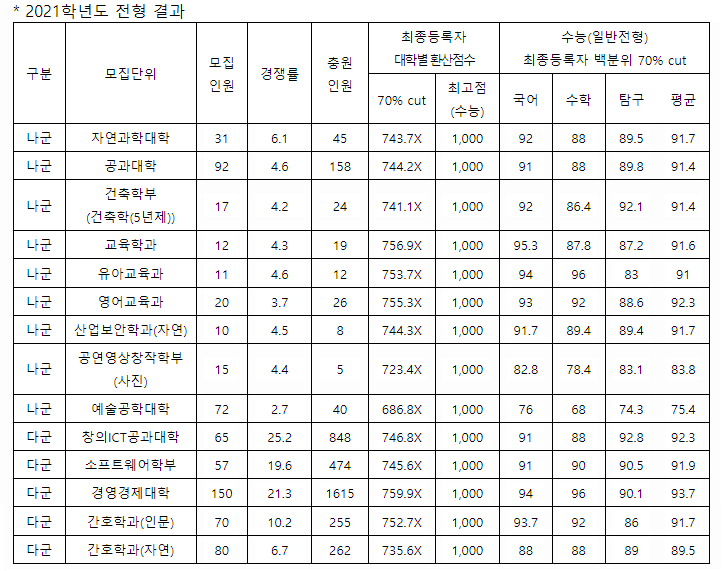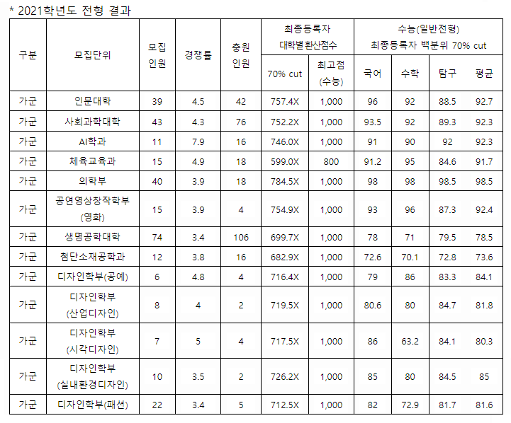 중앙대학교 2021학년도 정시 백분위 70%컷