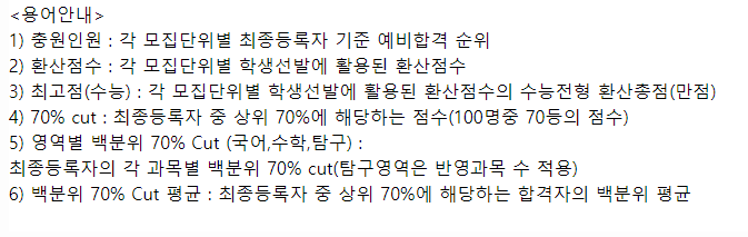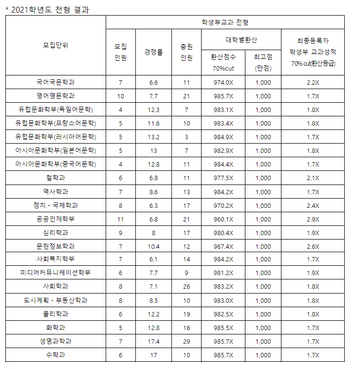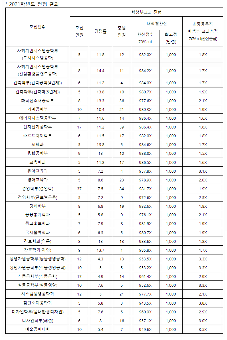 중앙대학교 2021학년도 학생부 교과전형(학생부교과)교과성적70%컷