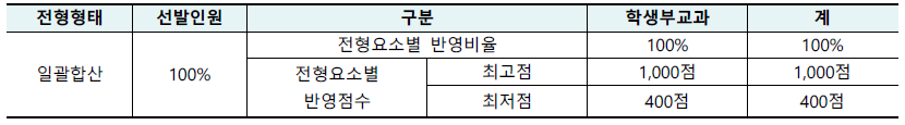 1) 교과성적 반영 비율 : 100% (단, 특기자 특별전형의 체육특기자는 교과 90%, 출석 10%)