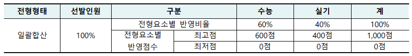 - 공연예술대학(실기우수자전형)의 경우, 탐구영역은 사회/과학/직업 탐구영역 중에서 1과목 반영
