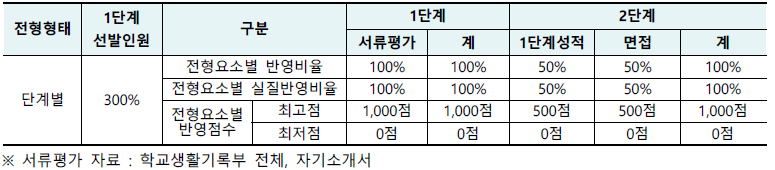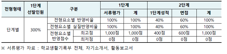 - 국내 고등학교 졸업(예정)자 또는 법령에 의하여 고등학교 졸업자와 동등 이상의 학력이 있다고 인정되는 자3. 전형요소 및 반영비율