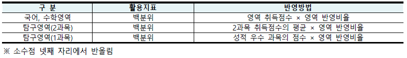 ※ 택1 영역 또는 1과목 반영의 경우 백분위 성적 우수 영역(과목)을 반영하고, 탐구영역 2과목 반영의 경우 백분위 점수 평균을 반영함
