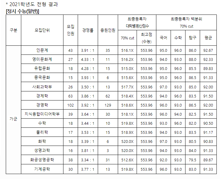 서강대학교 2021학년도 정시 입시결과 백분위 70%cut