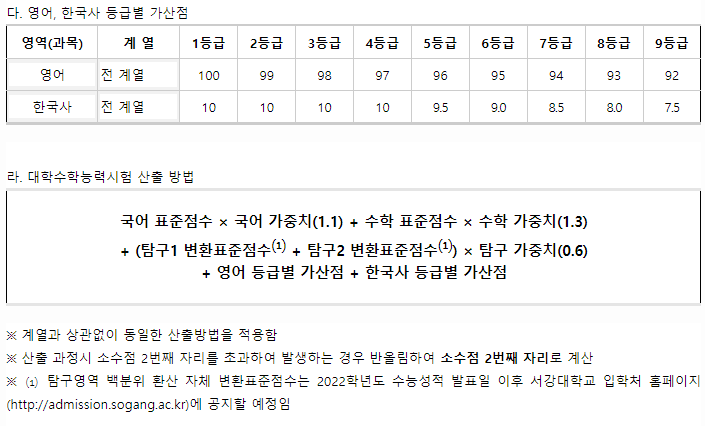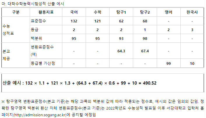 서강대학교 2021학년도 정시 수능성적 산출방식