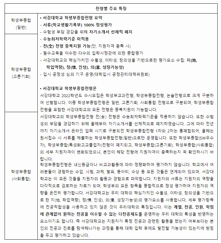 서강대학교 2021학년도 학생부종합전형 평가주안점 및 특징