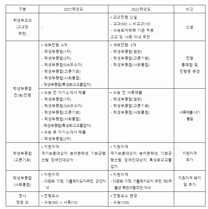 서강대학교 2021학년도 -> 2022학년도 변경사항
