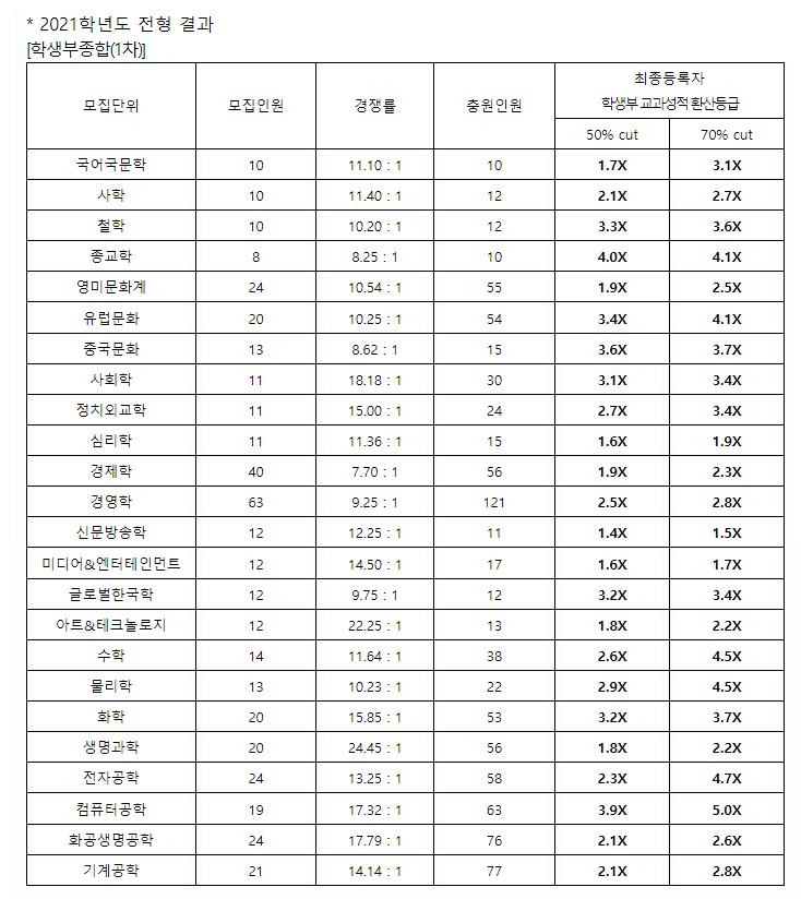 서강대학교 2021학년도 학생부종합전형(1차 종합형)입시결과