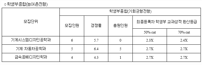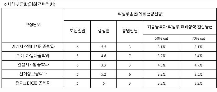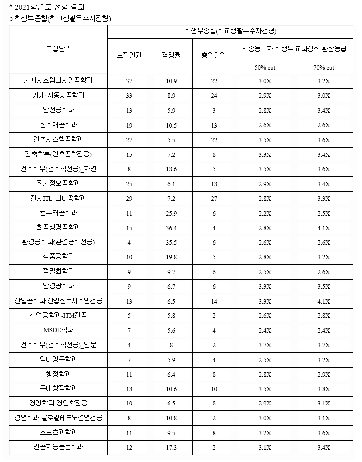 서울과학기술대학교 2021학년도 학생부종합전형 등급컷