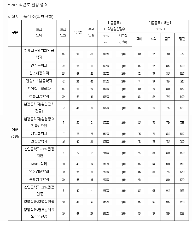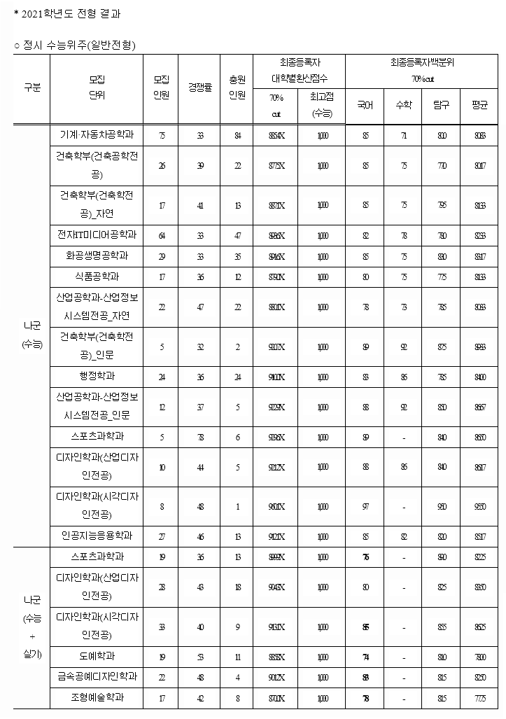 서울과학기술대학교 2021학년도 수시등급컷 정시 백분위등급컷