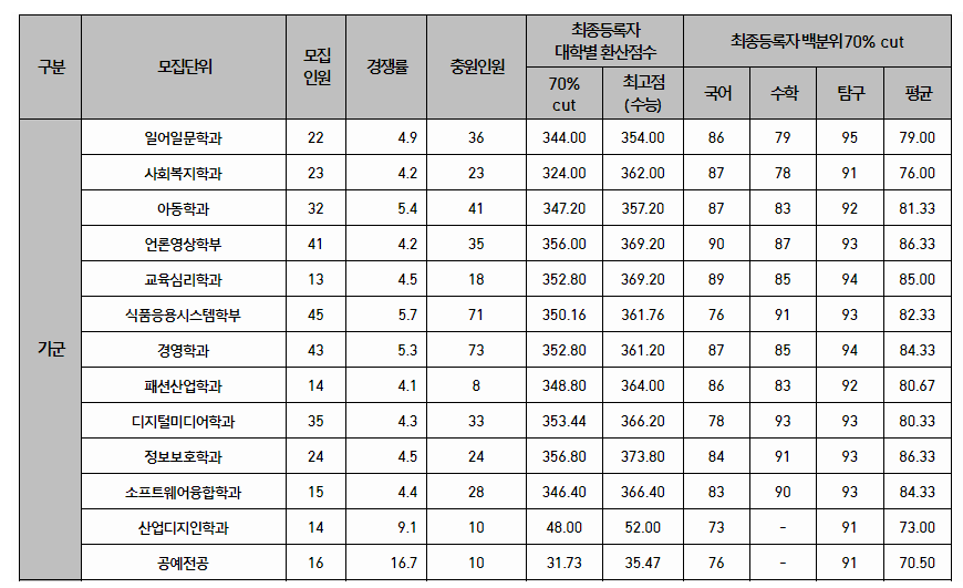 서울여자대학교 2021학년도 정시 최종등록자 백분위 70% 컷
