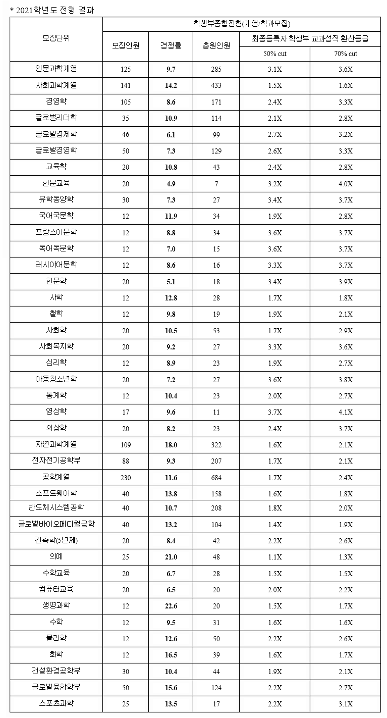 성균관대학교 2021학년도 학생부종합전형 입시 결과 (50% 70%등급컷)