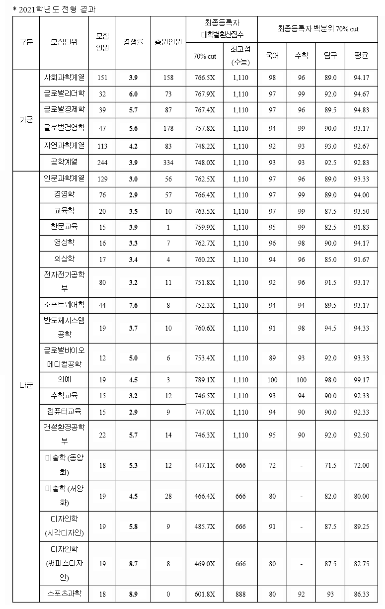 성균관대학교 2021학년도 정시 입시 결과 (백분위 70%컷)