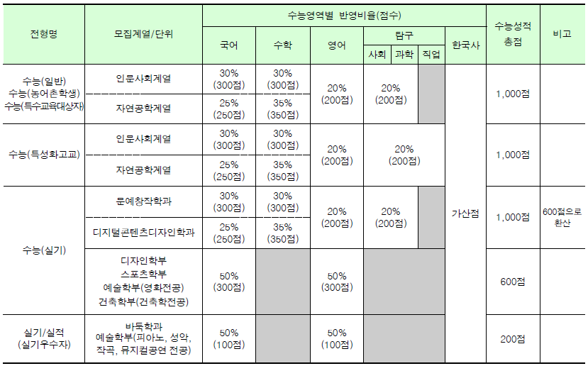 ※ 가산점 취득점수에 따라 수능성적 총점은 1,000점을 초과할 수 있음