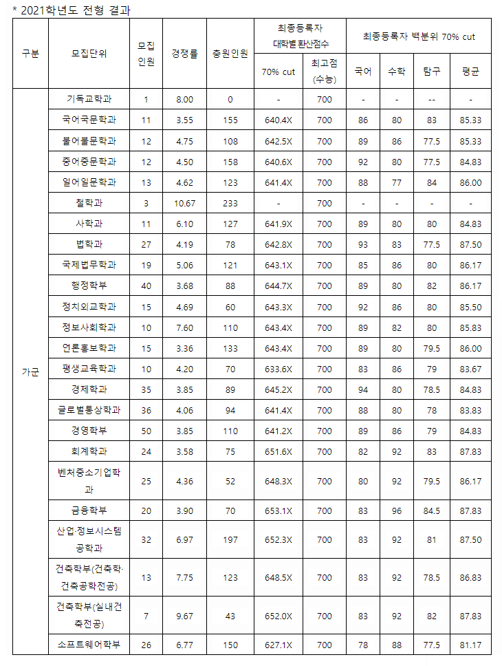 숭실대학교 2021학년도 정시 백분위평균컷