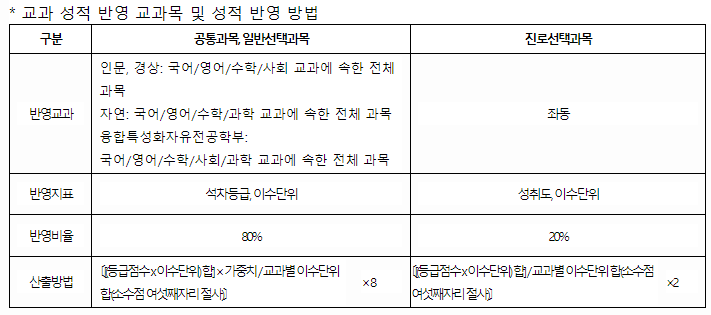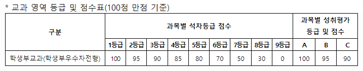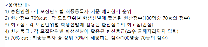 - 70% cut: 최종등록자 중 학생부 교과성적 순으로 상위 70%에 해당하는 점수 (교과성적 100명 중 70등 점수)
