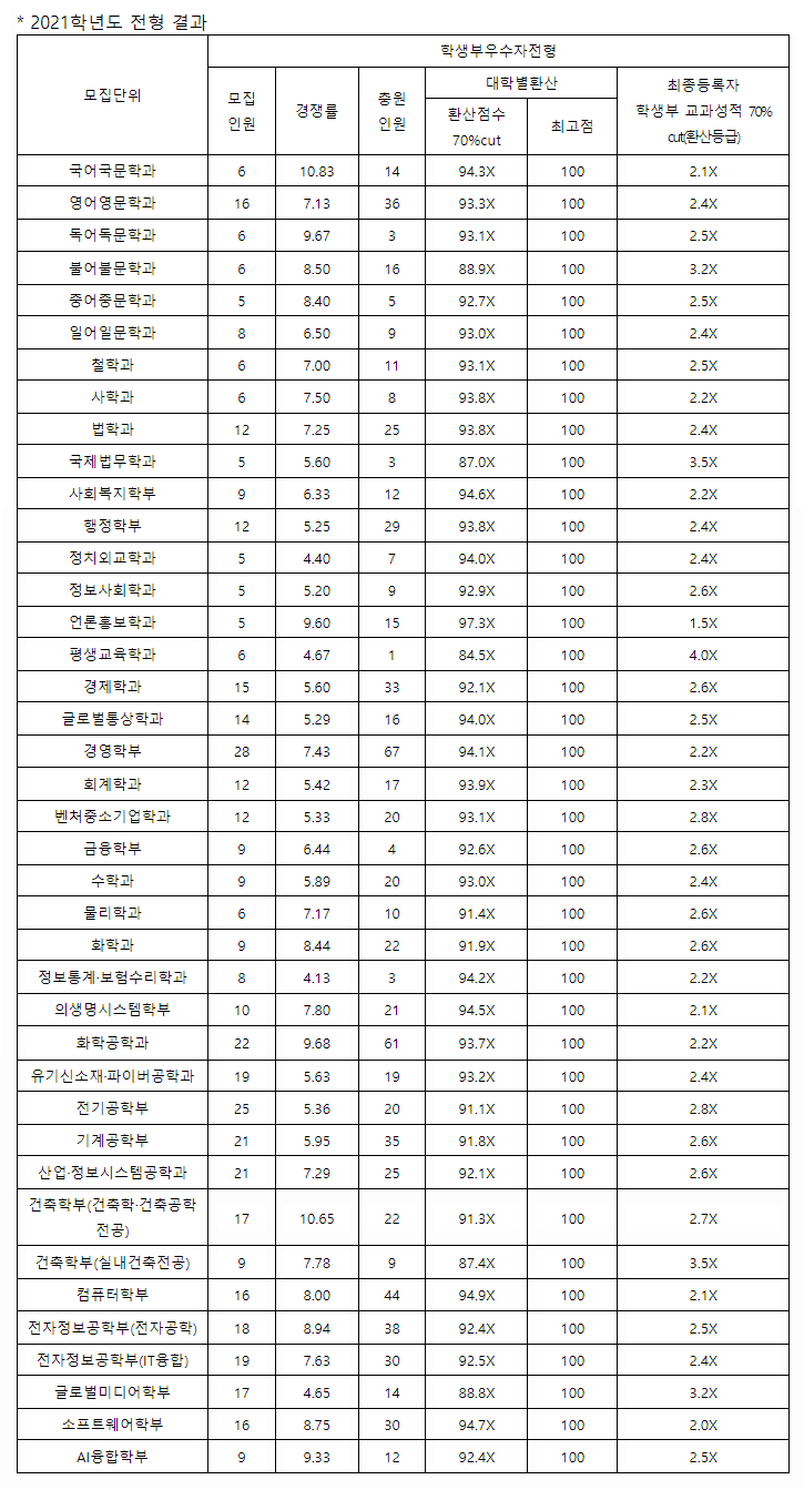 숭실대학교 2021학년도 학생부교과전형 입시결과