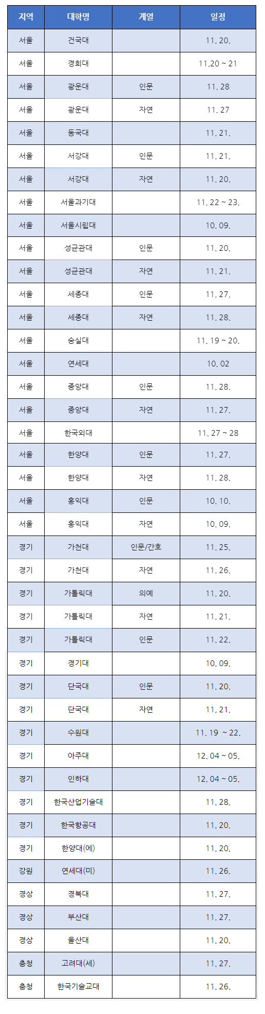2022학년도 논술실시 대학 전형일정 정리
