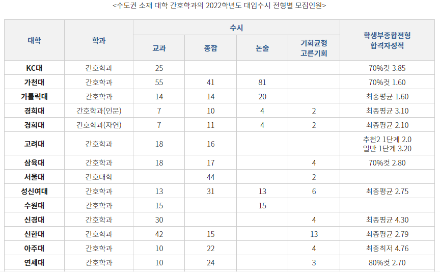 간호대 선호현상에 따라 수도권 모든 대학의 간호학과는 학생부교과전형에서 교과 성적 1~2등급 사이의 학생들이 지원하고 수도권 소재 전문대 간호학과도 합격생의 교과 성적이 1~3등급에 분포하여 교과 성적 평균이 3등급 이하 합격자는 찾아보기 어렵다.