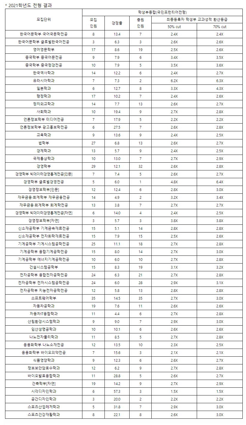 4) 70% cut : 최종등록자 중 학생부 교과성적 순으로 상위 70%에 해당하는 점수(교과성적100명 중 70등점수)