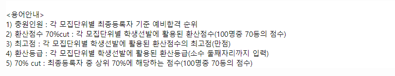 4) 70% cut : 최종등록자 중 학생부 교과성적 순으로 상위 70%에 해당하는 점수(교과성적100명 중 70등점수)