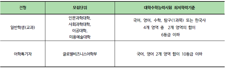 1) 대학수학능력 미접수자 또는 한국사 미응시자는 지원자격 미달로 처리함