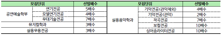 ※ ★ 표시의 모집단위는 단계별전형을 실시하며, 1단계전형은 실기 100%로 아래의 배수만큼 선발하여 2단계전형을 실시