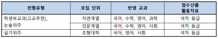 ❍ 학교생활기록부 반영 교과 및 점수산출 활용지표