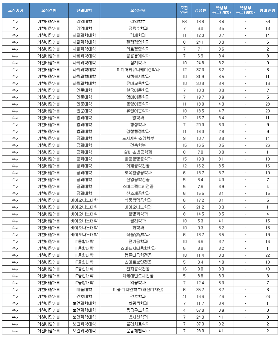 가천대학교 2022학년도 농어촌(교과, 종합)전형 학생부등급컷