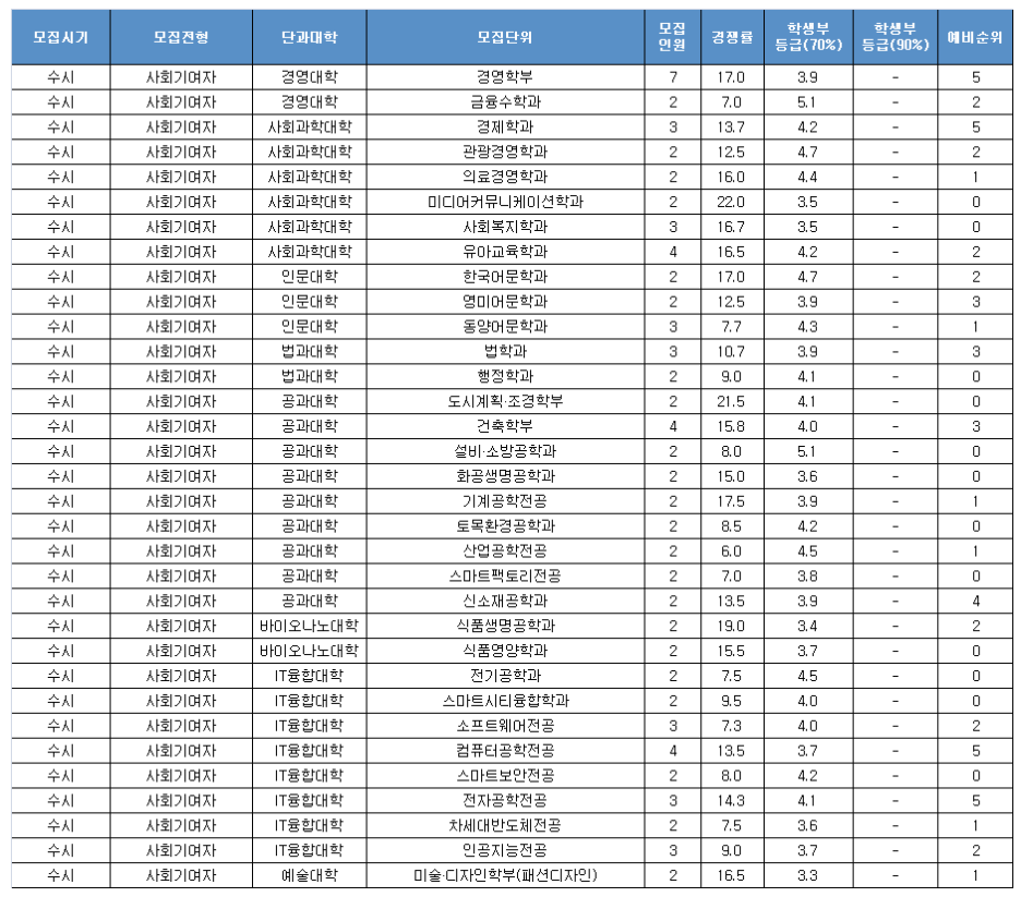가천대학교 2022학년도 사회기여자 전형 학생부등급컷
