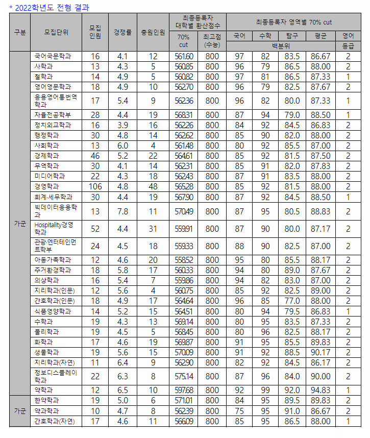 2022학년도 정시 나군 합격자 백분위 70%컷